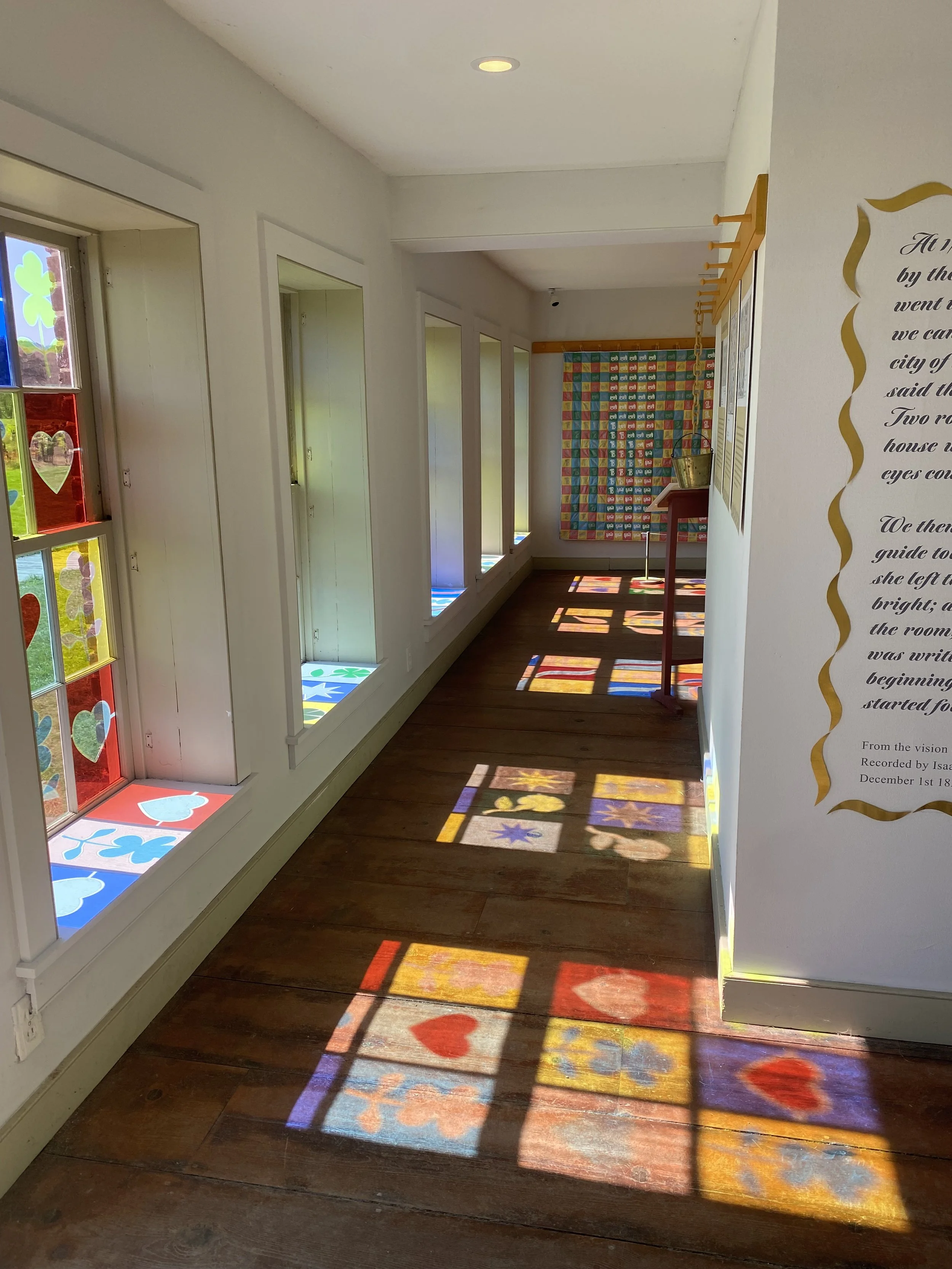 The rest of Molteni’s installation invokes the last paragraph, recorded by Youngs, in which Goff enters a room said to be “the first place Mother Ann came to after she left earth”. Inspired by her description, Molteni proposes an immersive theatrical staging space. Viewers can playfully imagine operating from the spirits’ side of the veil, behind which surroundings are viewed through “spiritual spectacles” and evocative symbols are projected for living Shaker Visionists. Colorful window collages that play with the Shaker concept of “borrowed” sunlight, cut paper treasures from iconic Shaker Gift Drawings, and calligraphic golden strokes of spirit writing are shown alongside Shaker artifacts from the museum’s collection. This pairing reinforces the Shaker desire to harmonize daily labor with worship as they build Heaven on earth.