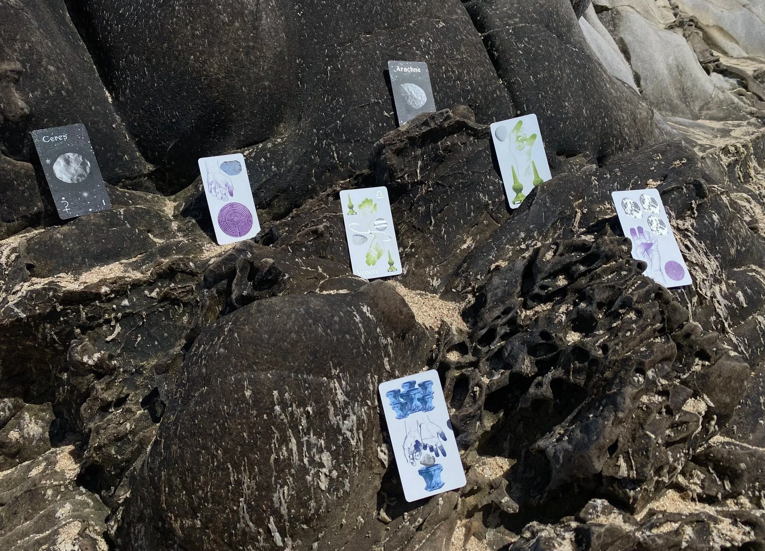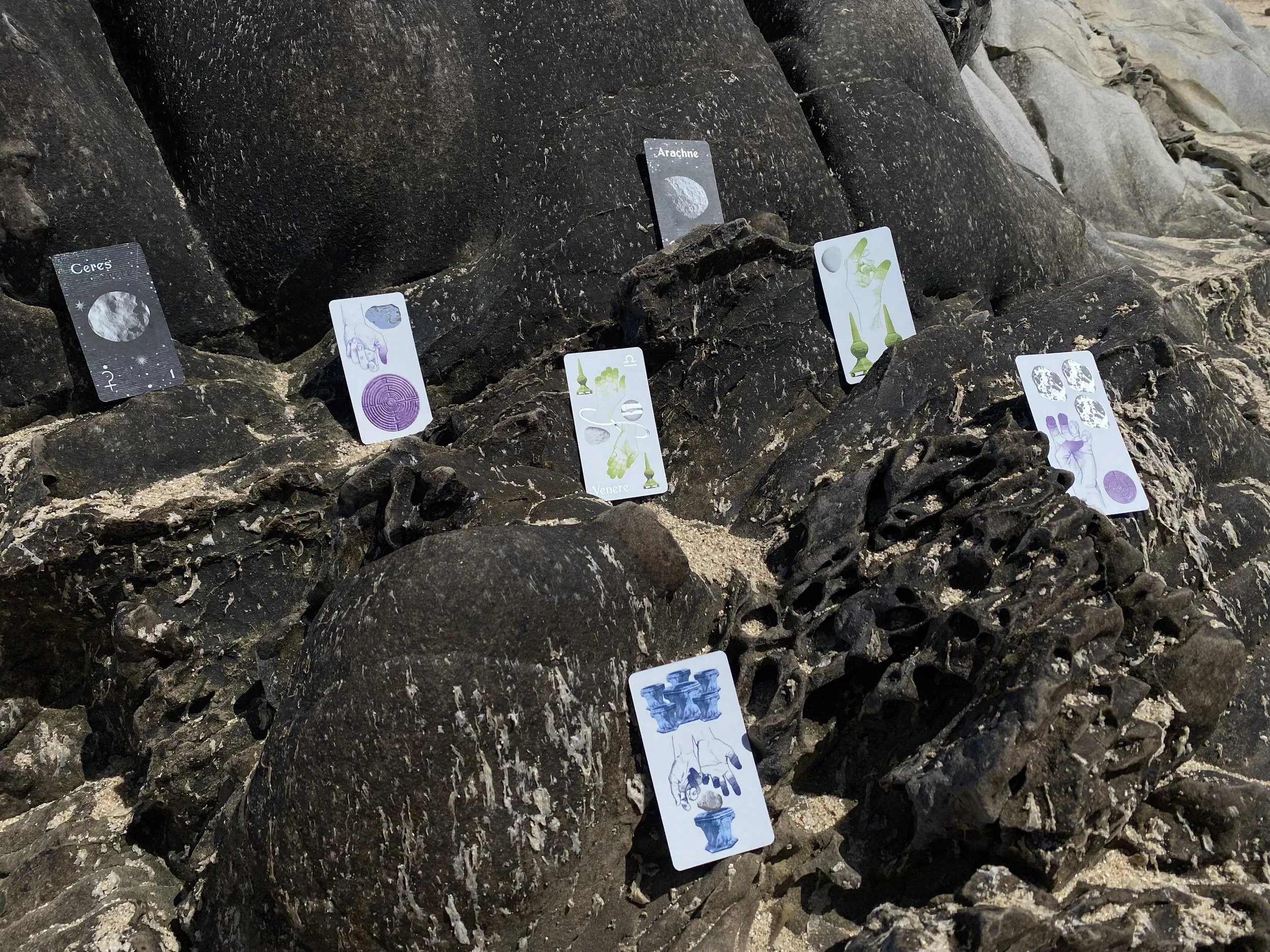 This work began serendipitously on the Great Solar Eclipse of 2017, when Molteni found their first Italian playing card on the floor of the Adriatic Sea. The work connects Molteni’s original deck of playing + divination cards and the popular Italian card game Scopa (meaning “broom”) to their avid interest in the Pleiades star cluster, global Seven Sisters mythologies, and a solo pilgrimage to seven Marian miracle sites sacred to the mountainous region of Campania.