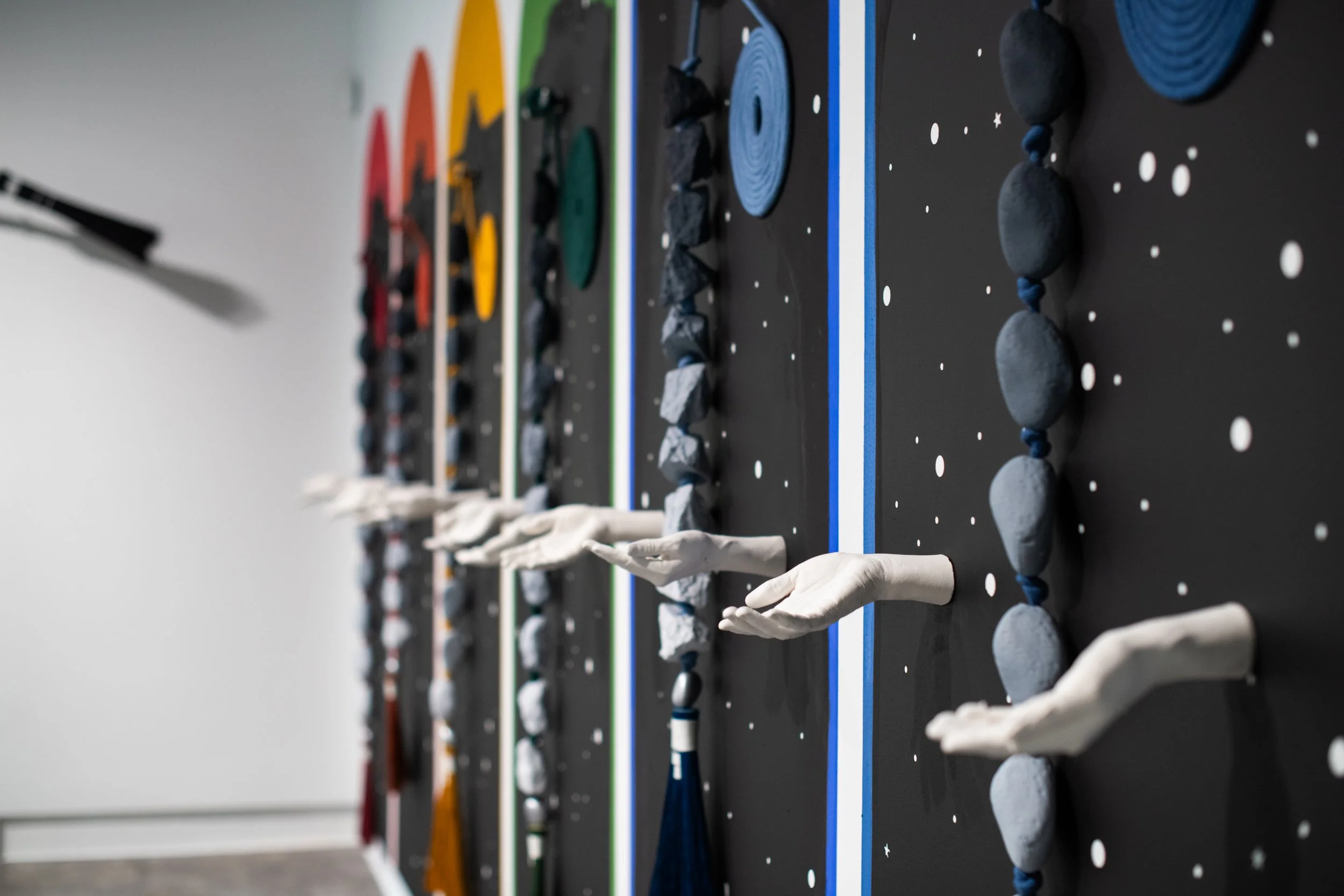 Heart of Stone builds upon an ongoing project called Counting to Infinity (Contando all’Infinito) and a body of work called Beautiful Seven (Settebello). Both gather around a set of fifty found stones and hand drawings which cradle their forms. Colored fingers reflect Molteni’s childhood habit of counting Hail Marys on their hands, like decades of Rosary prayer beads. Sibilline Books of Cumae speak of Cibele, a large black meteorite stolen from Phrygia by Romans when they learned of the great mountain mother’s rock form. Biblical excerpts coax the human heart away from the earth and toward a purified “flesh”. Meanwhile, the animistic world, by which shells, lagoons, mountains, comets and stars are alive and pulsing, observes the heart of stone. When counting beads and beats, bodies reunite with the rhythms of heaven and earth. Through this lens Molteni exercises what they call Celestial Antiphony, a call-and-response relationship with the divine.