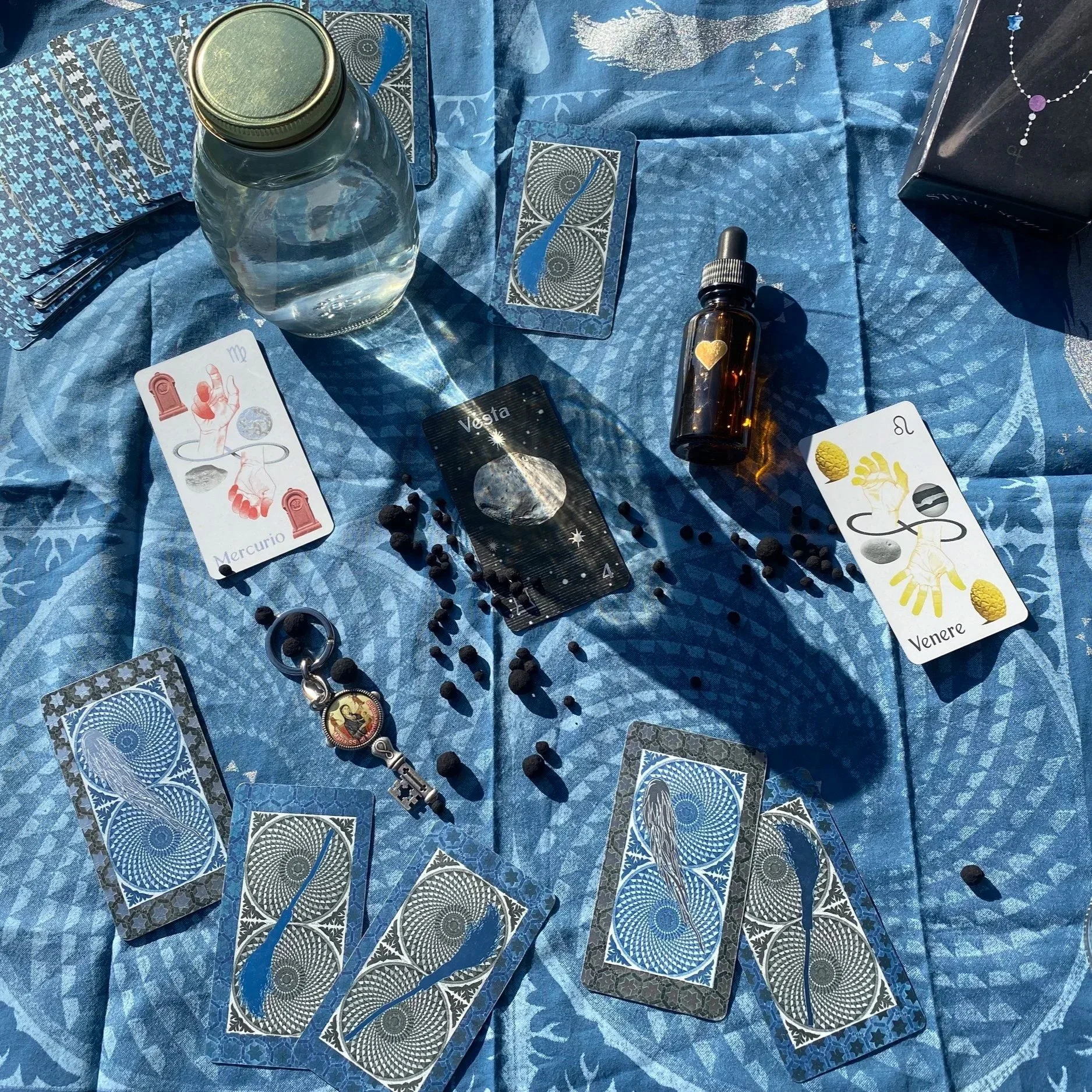 An original deck of playing/ divination cards- inspired by Italian Scopa & Tarot Cards. Charmed by celestial and terrestrial iconography. Purchase your deck and accompanying zine, altar cloth, and more HERE.